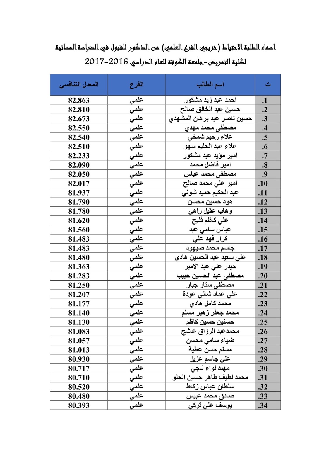 المطلبة المقبولين في الدراسة المسائية في كلية التمريض جامعة الكوفة للعام 2016 2017