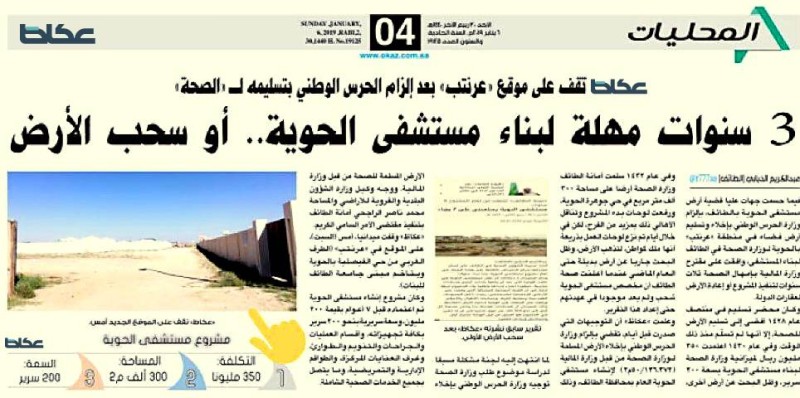 مستشفى الحوية متعثر منذ 10 أعوام و صحة الطائف لـ عكاظ المشروع متوقف حاليا أخبار السعودية صحيقة عكاظ