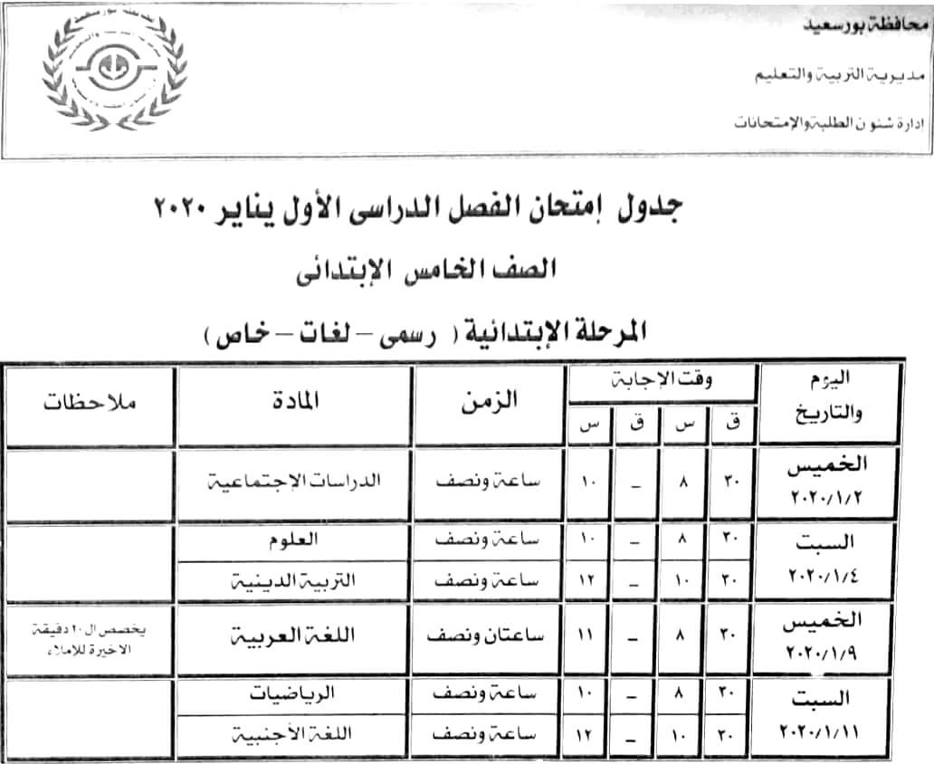 جدول امتحانات الصف الخامس الابتدائي الترم الأول 2020 بورسعيد
